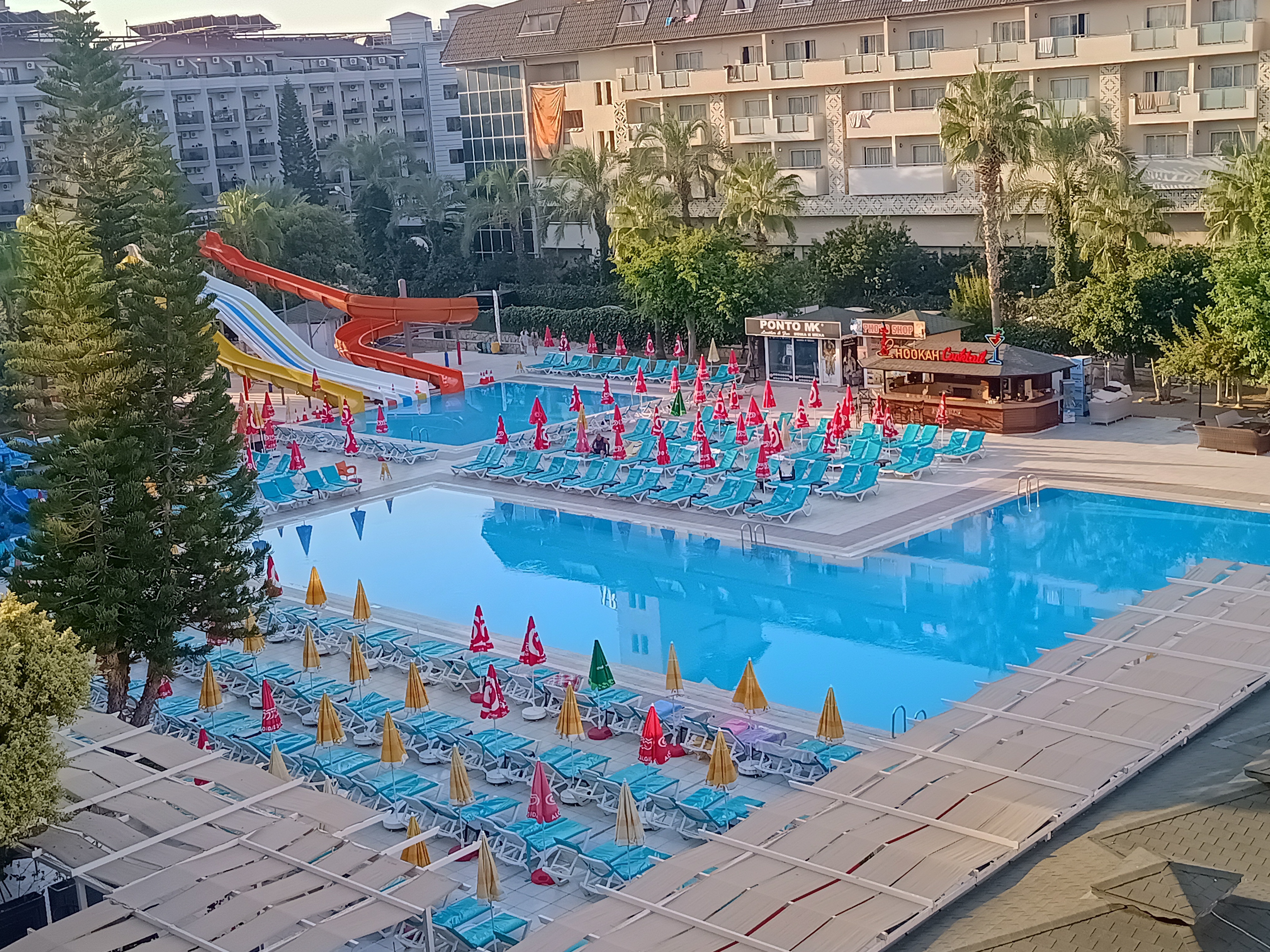 Wróciliśmy właśnie z 10 dniowego pobytu w tym hotelu. Po przeczytaniu opinii tutaj i na TripAdvisor zdecydowaliśmy się pojechać z dwójką dzieci. Pokoje: Tutaj patrząc na zdjęcia innych klientów mieliśmy największe obawy. Finalnie pokój bardzo czysty, łazienka błyszczała, zero zacieków czy grzyba jak na niektórych zdjęciach. Mieliśmy wgląd do dwóch pokoi na różnych piętrach i oba były czyste. Jedzenie: Przy każdym posiłku da się znaleźć coś dla siebie - nie ma opcji, że ktoś wyjdzie głodny, jedne potrawy smaczne inne mniej. Część jedzenia robiona przy klientach (omlety, pancake, smażony kurczak i kilka innych potraw), część jedzenia w bemarach. Świeże owoce, soki, możliwość zrobienia sobie tostów. Animacje: Nic specjalnego. Dwa albo trzy razy trafiliśmy na piana party, do tego codziennie jakiś aquaaerobik, mecz piłki w wodzie. Był też dmuchany "tor" w basenie, po którym trzeba było przejść czy ślizg na desce i rzut piłką do kosza. Wieczorami dwa razy był jakiś wybór miss, raz karaoke, kilka razy potańcówka i raz głośniejsza dyskoteka. Wieczorne animacje bardzo głośne ale kończyły się każdego dnia o 23, więc dało się przyzwyczaić. Dyskoteka trochę dłuższa, zakończyła się o 24 z tego co pamiętam. Na minus to, że wieczorne animacje są bardzo głośne więc nie da się wysiedzieć wtedy na balkonie, bo nie słychać rozmów między sobą. Baseny: Każdy czynny do godziny 19 (wydało mi się to dziwne, sporo osób czy to dorosłych czy dzieci zapewne posiedziałoby tam trochę dłużej), trzy zjeżdzalnie które niestety czynne są tylko dwa razy dziennie po 2h, w brodziku fajna zjeżdżalnia z fontanną dla najmłodszych. Woda czysta, choć w brodziku trochę ślisko, najgorsze jednak są płytki w okół basenów, nie raz czy to dorosły czy dziecko się przewrócili. Plaża: Dla nas tragedia, bardzo szybko robi się głęboko w morzu, leżaki widać, że zużyte, żwirek na plaży zbyt gorący dla dzieci nawet w butach do wody, nie ma co myśleć o tym, żeby usiedli i się pobawili w piasku. Bar plażowy czynny, napoje, piwo, lody dla dzieci, które są wliczone w cene allinclusive. Byliśmy tylko raz przez kilka minut i na plażę więcej nie wróciliśmy. Obsługa: Fantastyczna, uśmiechnięta, pomocna. Część obsługi mówi i rozumie w języku polskim (na pobliskim bazarze sprzedawcy również mówią po polsku), więc osoby bez angielskiego na 100% się dogadają w prostszych sprawach. Na minus to, że tylko pojedyncze osoby mówiły po angielsku biegle, na tyle, żeby załatwić jakąś trudniejszą sprawę. Atmosfera: Nam się podobało, nie było wybitnie ale nie żałujemy pobytu, dzieci i my bawiliśmy się dobrze a to chyba najważniejsze. Trzeba mieć z tyłu głowy, że hotel jak i okolica są nastawieni na turystów z rosji (cała obsługa mówi biegle w ich języku), strzelam, ze 80% obłożenia hotelu to właśnie oni, nie raz zdarzyło się, że byli faworyzowani przy barach, podchodząc bez kolejki i dostając od razu drinka czy piwo. Zdarzały się też sytuacje, że pozostawiali po sobie ogrom śmieci, czy nawet kobiety przeszukując swoje torebki po prostu wyrzucały papierki czy chusteczki na ziemie przy leżakach, dno... Nie zdarzyło się za to ani razu, żeby ktokolwiek się awanturował czy po nocy "imprezował" na korytarzu. W pobliżu hotelu trzy sklepiki spożywcze, bazarek, dwie apteki. Podsumowując, nam się podobało, wiedzieliśmy, że to nie 5* hotel więc oczekiwań nie mieliśmy zbyt ogromnych.